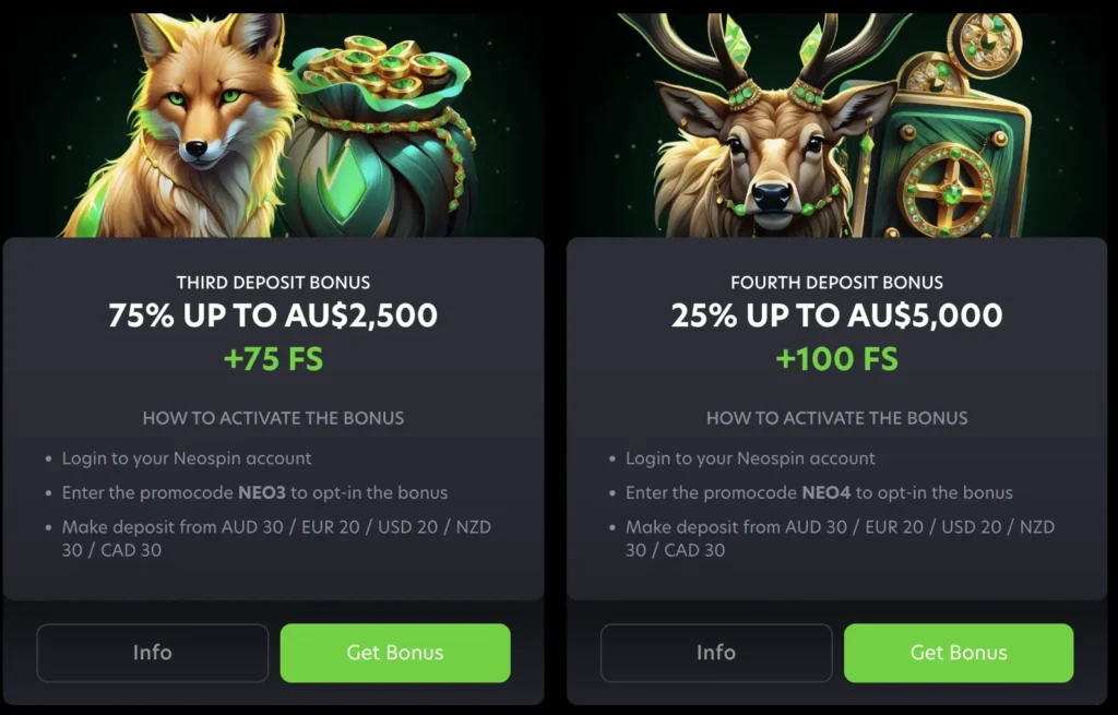 Players who have maximised the welcome package can continue to claim more promos, like the 20% daily cashback, 66% weekend reload up to A$1,000 and 100 FS package. There is always a special offer for your Neo Spin Casino bonus to claim and fund your session. The best part is that we keep these incentives simple. Some have playthrough requirements of 3x, while most can be activated with as little as A$30.