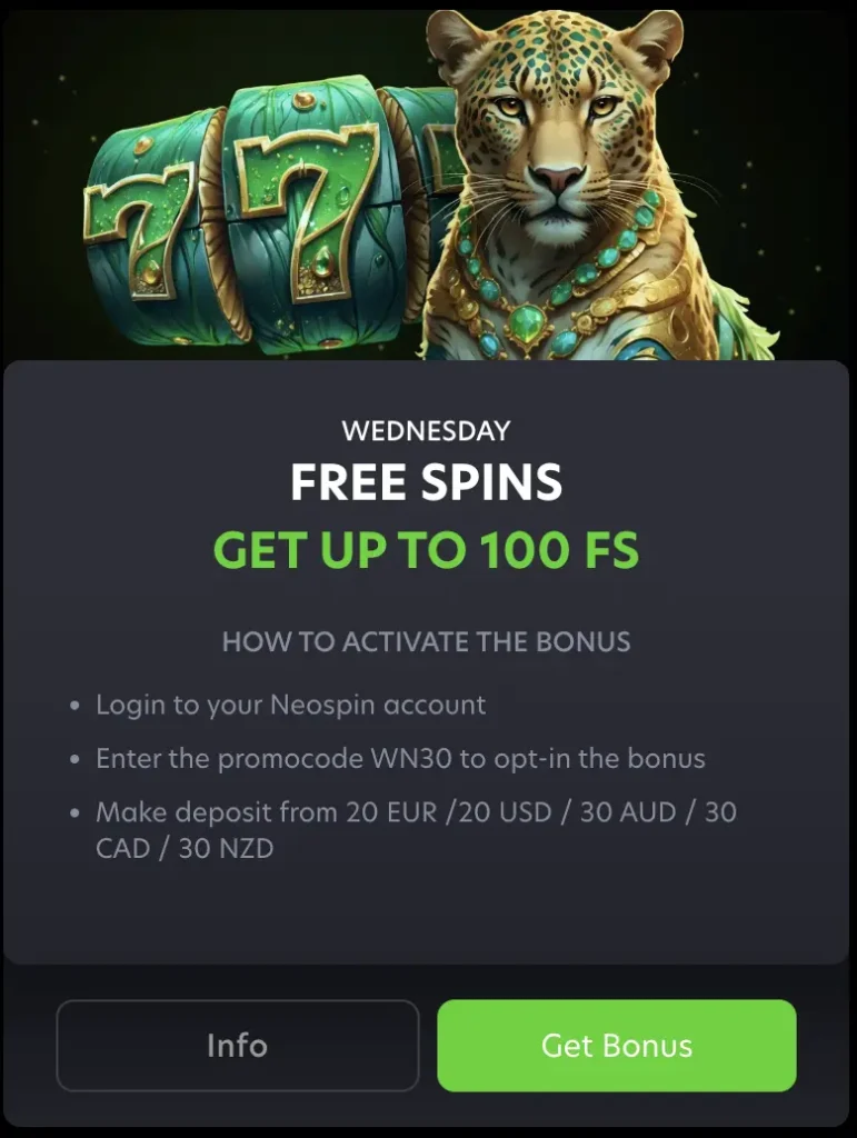 We award our players different types of free spins, including a Wednesday package that delivers up to 100 FS for a starting deposit of A$30. To claim this particular NeoSpin Casino FS, you need to credit your account with a relevant amount and use the relevant valid code. Here is a breakdown of the offer: