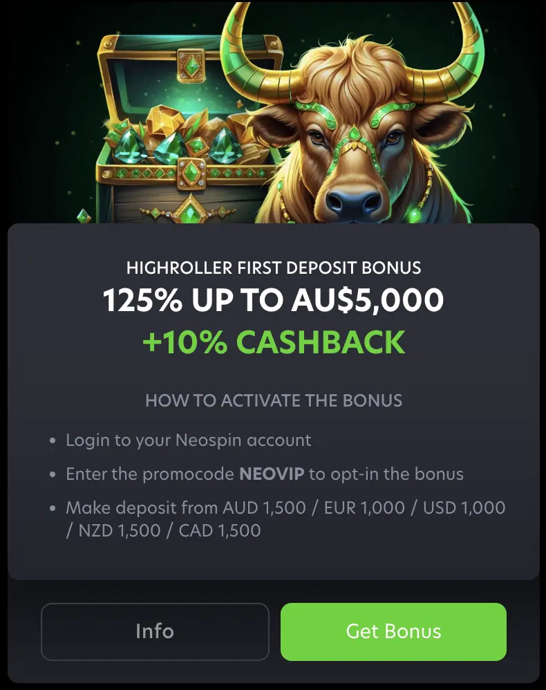The 125% Highroller first deposit gift up to A$5,000 + 1% cashback is an alternative starter pack for players who are willing to deposit at least A$1,500 after registration. This particular NeoSpin Casino bonus can significantly increase your overall welcome package when fully maximised. To claim it all, you must credit your account with A$4,000. Also, do not forget the important voucherrequired for activation: NEOVIP. You receive a 10% cashback on losses accrued when gambling with this reward.
